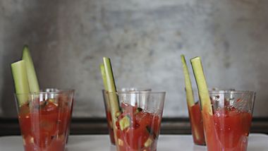 Para mí, pocos vegetales transmiten la frescura del verano como los pepinos y los tomates. La combinación de ambos es siempre perfecta, refrescante, e invita al relax y a la diversión. Debe ser porque ambos son ligeros y frescos y, a menos que tengas problemas de salud, es difícil que te caigan mal. Como el calor aprieta en muchas partes del mundo, te traigo estos shots de fresquísimo gazpacho, aunque con una ligera variación. Es sabido que hay miles de versiones de esta sencilla receta, tantas como cocineros hay en España, pero para esta en especial, los tomates no se usan frescos sino asados. Creo que esto les da un sabor diferente y especial, combinando de maravilla con los vasitos de pepino. Estos shots son los perfectos hors d´oeuvres para cualquier ocasión, ricos y saludables. En el sur de España, donde hace tanto calor durante casi todo el año, es costumbre que en todas las casas se preparen jarras de gazpacho que se mantienen refrigeradas y se toman a todas horas del día. Dime tú si esta receta no es saludable y facilísima de hacer. Cuando tienes visitas no hay nada más que hacer los vasitos de pepino y en unos cuantos minutos tendrás lista una original entrada, colorida y super rica. Sirve estos shots en la playa o la piscina, en el campo o en tu propia casa. Es una receta de pepino que siempre podrás hacer porque lo más seguro es que tienes los ingredientes en casa. Anímate a prepararla y verás qué refrescante es.