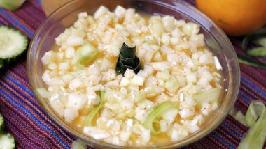 Agrega parte del pimiento y del pepino bien picaditos en cuadritos, para que le den textura al gazpacho.