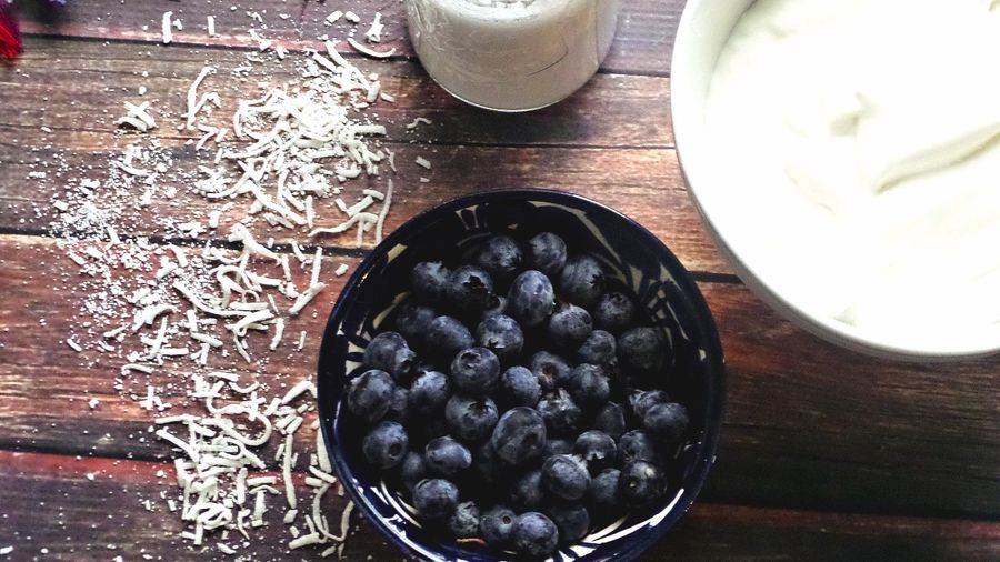 4Vierte en un vaso grande. Adorna con coco rallado y moras azules. ¡Buen provecho!