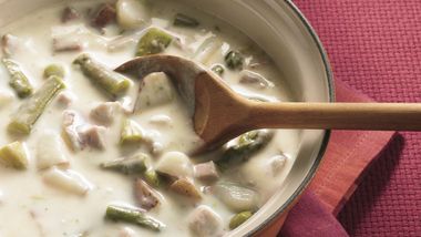 Añade la leche half-and-half. Cocina de 2 a 3 minutos, revolviendo ocasionalmente, hasta que esté caliente (que no hierva).