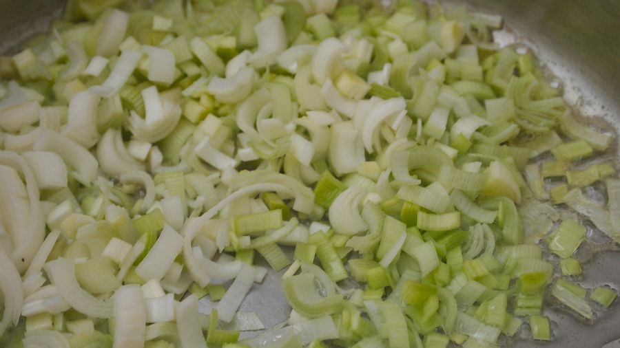 Calienta el aceite en una olla a fuego medio. Sofríe el poro hasta que comience a dorar, revolviendo con frecuencia.