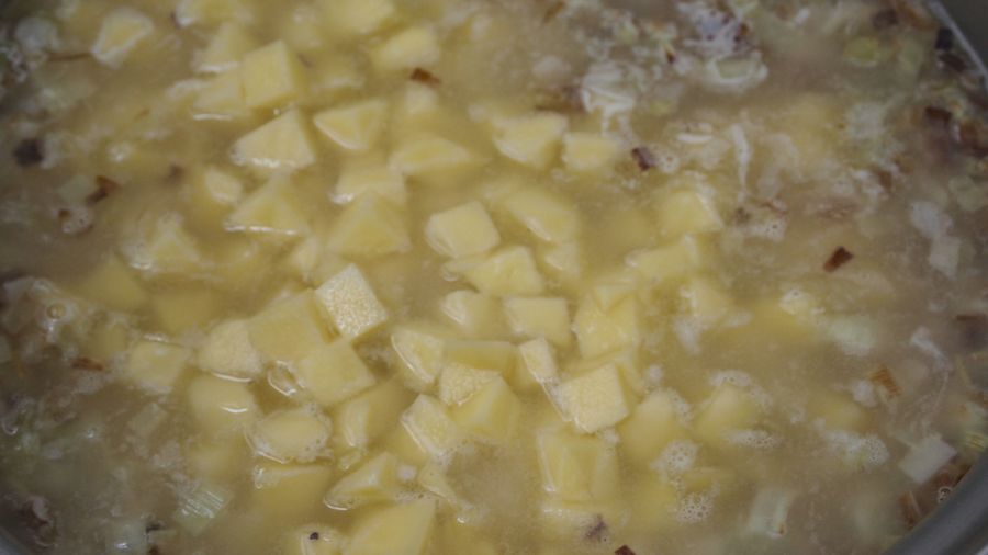 Incorpora las papas, tapa parcialmente y lleva a ebullición; baja el fuego a medio-bajo y cocina hasta que las papas estén suaves y la sopa cremosa.