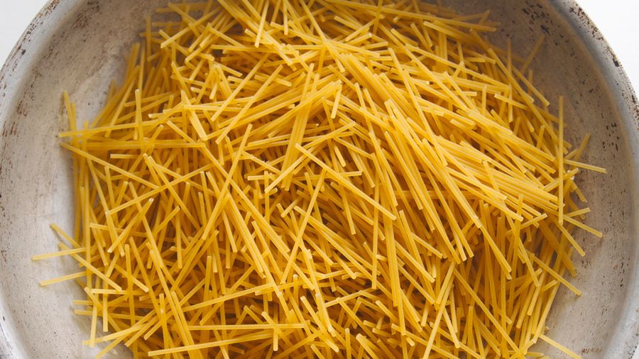 Mientras tanto calienta el aceite en una sartén y dora ligeramente los fideos. Viértelos en la sopa y deja cocinar hasta que estén suaves. Prueba la sopa y sazona con sal y pimienta.