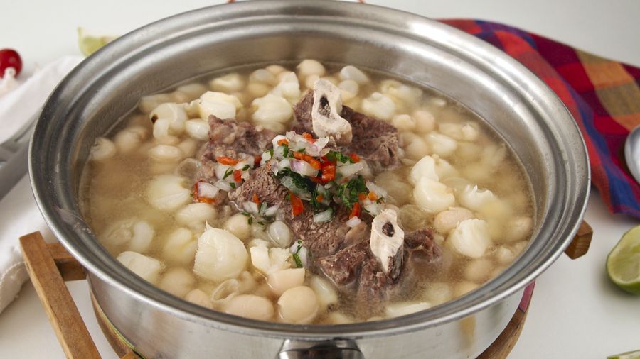 La sopa de gallina pinta, cuyo nombre me encanta, no es ni pinta ni es de gallina. Es original de Sonora, México y se hace con carne de res, de esa que se cocina a fuego lento durante un buen rato para que suelte todos sus sabores y se suavicen los frijoles pintos y maíz pozolero. El caldo queda súper rico con cebolla, ajo y chiles, más los sabores de todos los ingredientes. Se sirve con una salsita cruda de cebollas, chiles y hierbas que le dan un toque de sabor adicional y color.