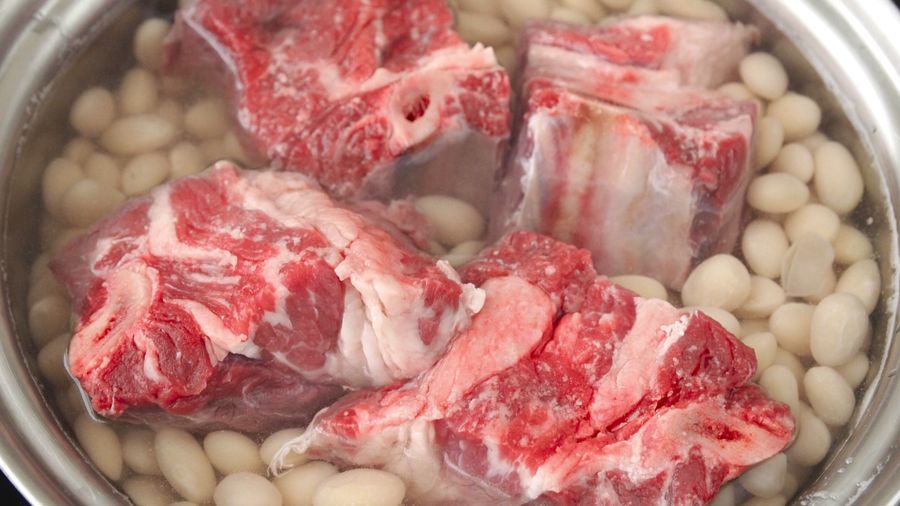 Pon la carne en una olla, cubre con agua, lleva a ebullición a fuego alto, espumando de vez en cuando, y hierve por 1 hora.