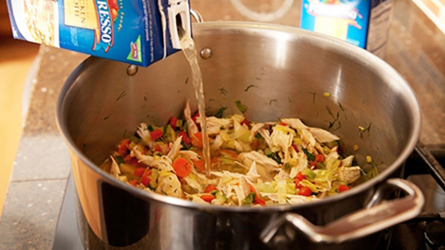 Incorpora el caldo, el pollo, el eneldo y la sal. Calienta hasta hervir.