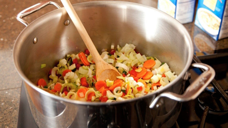 Calienta el aceite de oliva en una olla o cacerola con tapa de 4 a 5 cuartos de galón a fuego medio-alto. Cocina la cebolla, el ajo, las zanahorias, el pimiento, el puerro (poro) y la calabacita aproximadamente de 5 a 10 minutos, revolviendo ocasionalmente hasta que las zanahorias estén tiernas.