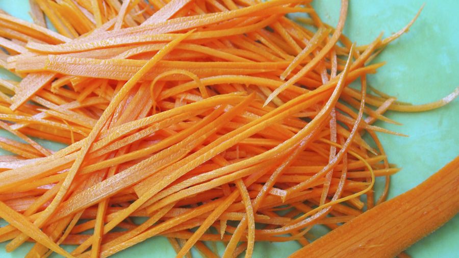Corta la zanahoria en hilitos finos usando una mandolina (o un pelador de papas).