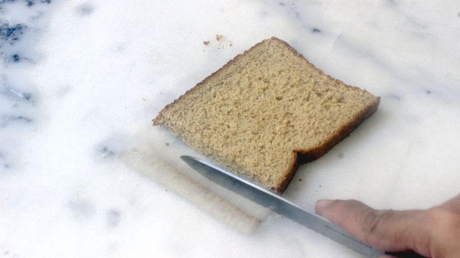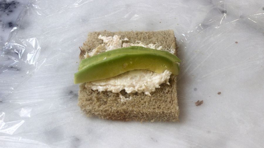 Unta aproximada 1 1/2 cucharada de la mezcla en cada rebanada y 2 rebanadas finas de aguacate.