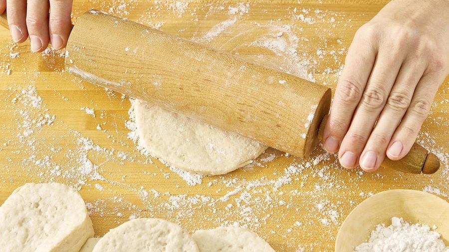 3Separate dough into 8 biscuits. On a lightly floured surface, press or roll each biscuit into a 5-inch circle.