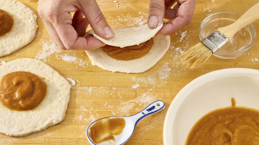 4Fill each circle with 2 to 3 tablespoons of sweet potato mixture. Using a pastry brush, brush a little water around the edge of the biscuits.