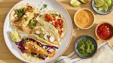 4Calienta las tortillas. Agrega el pescado, la guarnición y la salsa. Agrega la crema.
