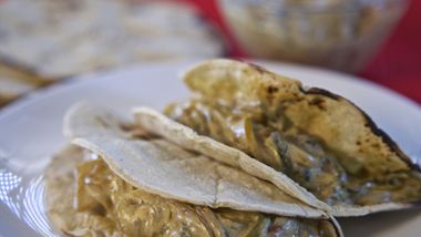 • Para mí, uno de los mejores tacos son los que no llevan carne. Con verduras frescas y el condimento indicado, los tacos pueden ser la cena vegetariana perfecta para disfrutar en familia. Las rajas, o las tiras de chile poblano con tu queso favorito, se combinan de maravilla en una tortilla de maíz calentita. Prepara estos sabrosos tacos para un grupo grande o como un almuerzo liviano para ti solo. Como sea que decidas comerlos, ¡te aseguro que te encantarán!