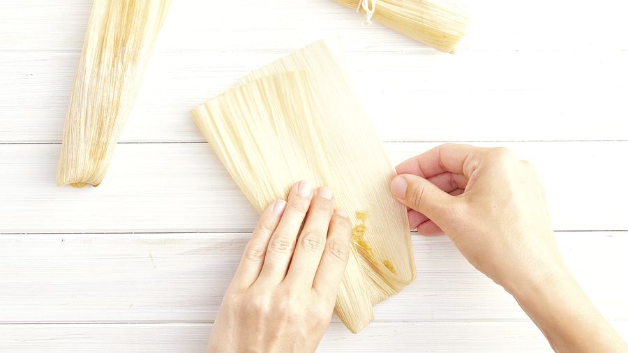 1Sumerge las hojas de maíz en un recipiente hondo con agua tibia y déjalas reposar hasta que estén manejables, al menos unos 30 minutos.