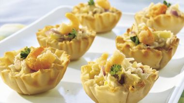 Hornea los moldecitos de pan a 350°F por 12 a 15 minutos o hasta que estén ligeramente dorados. Retira del horno y deja enfriar. (Si la masa se inflo durante el horneado, solo retira un poco de la masa del centro con una cuchara para poder rellenarlas.)