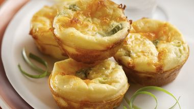 Corta la pasta en 12 cuadrados. Con suavidad, presiona los cuadrados en 12 minimoldes para muffins, sin engrasar y moldea los bordes para formar bordes de un cuarto de pulgada de alto. Con una cuchara, reparte el queso en los moldes cubiertos con pasta. Cubre cada molde con tocino y cebolla. En un tazón pequeño, bate el huevo y la crema batida con un batidor de alambre o con un tenedor, hasta que se mezclen. Coloca menos de 1 cucharada de la mezcla en cada molde.