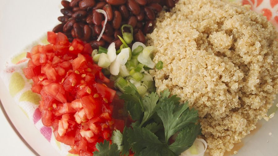 Quínoa: Combina en un recipiente la quínoa, frijoles rojos, tomate, cebolla y jugo de limón. Sazona con sal y pimienta.