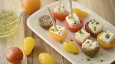 En un tazón mediano, mezcla el resto de los ingredientes para rellenar los tomates (jitomates). En un tazón chico, mezcla los ingredientes para el relleno. Sirve aproximadamente 1 cucharada de la mezcla de aguacate en cada mitad de tomate (jitomate). Cubre cada una con aproximadamente 1 cucharadita de relleno.