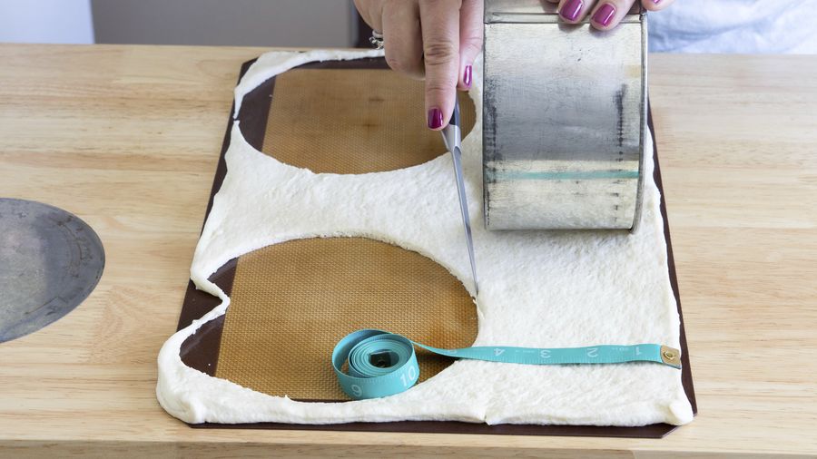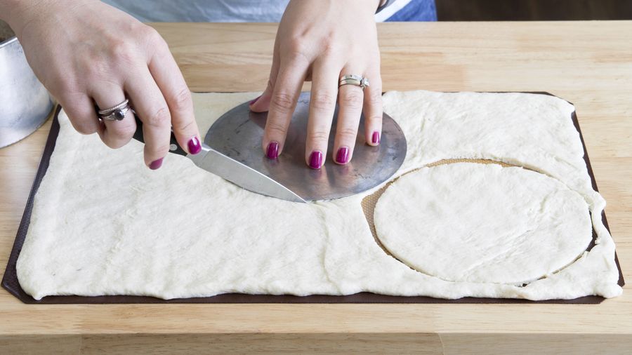 Mide el diámetro de un molde alto para horno. (El molde que se usó fue de 6 pulgadas de diámetro por 4 pulgadas de alto.) Desenrolla una lata de masa sobre la superficie de trabajo; presiona para formar una capa delgada. Corta 3 (6 pulgadas) bollos; colócalos en la placa para galletas. Hornea durante 8 minutos. Retíralos de la placa para galletas y colócalos en una rejilla para enfriar; deja enfriar.