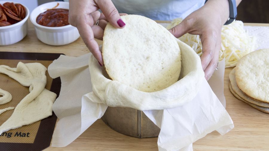Coloca la masa pendiente sobre la capa superior de la torta de pizza para formar el borde de la masa.