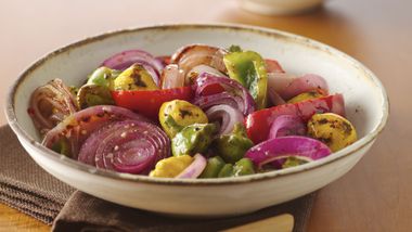 En un tazón grande, mezcla las verduras con 1 cucharada de aceite para cubrirlas en forma pareja. Acomódalas en una charola o bandeja de 15x10 pulgadas, sin engrasar; espolvorea con sal para sazonar.