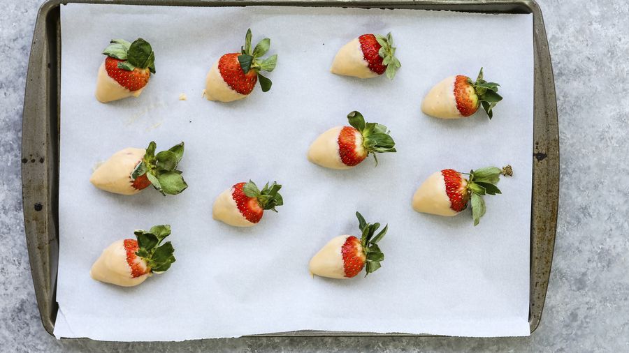 3Cubre las fresas en la salsa de yogurt y coloca sobre un recipiente con papel encerado.