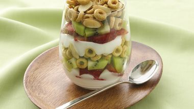 2Coloca 1 taza de Very Berry Cheerios™ en una bolsa de plástico hermética y cuidadosamente tritura los Cheerios con una cuchara o rodillo. Coloca en el plato o taza en porciones iguales.