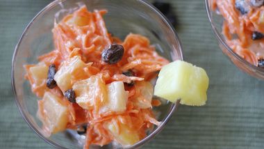 Divide igualmente las zanahorias, el apio y las pasas entre las cuatro tortillas.