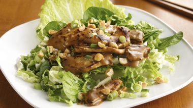 Sirve el pollo sobre las hojas de lechuga y el resto de la salsa que reservaste. Decora con más hojas de albahaca y sirve.
