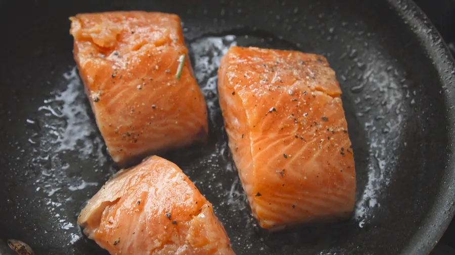 Turn the salmon over and cook it for two or three more minutes or until the salmon is slightly golden brown.