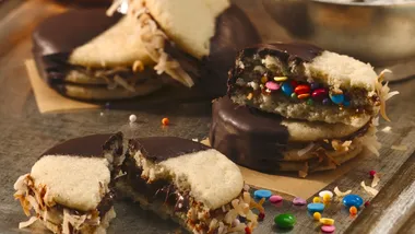 Sprinkle tops of sandwich cookies with powdered sugar. Store between sheets of waxed paper in tightly covered container.