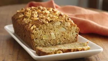 Heat oven to 350°F. Grease bottom only of 9x5-inch loaf pan with shortening or cooking spray. Place cereal in resealable food-storage plastic bag or between sheets of waxed paper; crush with rolling pin. In large bowl, mix crushed cereal (about 3/4 cup), apple juice and vanilla; let stand 10 minutes.
