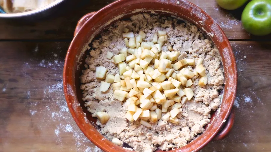 Whip the butter and sugar with a mixer on medium speed for 2 to 3 minutes until it’s soft and fluffy. Add the harina masa, whipping until it’s completely mixed and gritty. Add the milk and applesauce, whipping for a minute. Then, add the chopped apples and cover them with the mix.