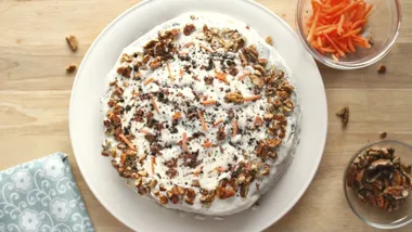 In large bowl, mix oats, applesauce, brown sugar, carrots, egg product and oil with spoon until well mixed. Stir in remaining cake ingredients just until moistened. Pour into pan.