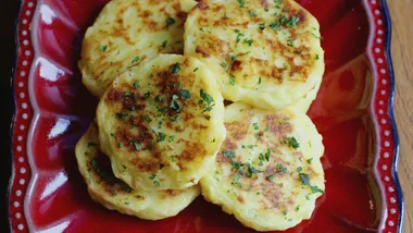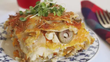 Grease a square baking dish and add a layer of potatoes. Season with salt, pepper and anise. Add a layer of cheese and strips of red pepper. Repeat until you finish with a layer of potatoes.