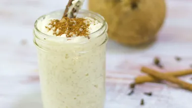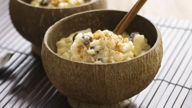 Serve in individual ramekins, sprinkled with ground cinnamon and shredded coconut. You can decorate it with a cinnamon stick cut in half and some blueberries.