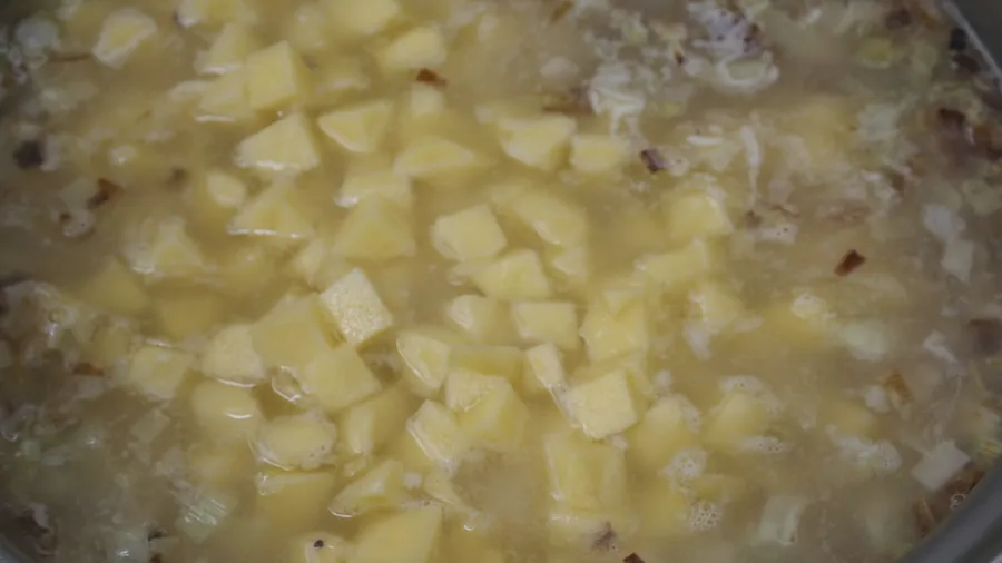 Incorporate the potatoes, cover partially and bring to a boil; lower the heat to medium-low and cook until the potatoes are soft and the soup is creamy.