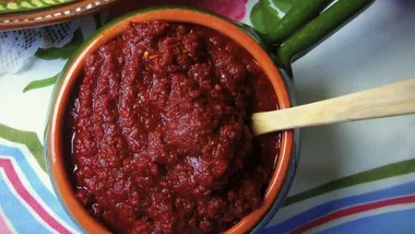 Use a blender or food processer to combine the chili peppers, onion, garlic, vinegar, salt, oregano, and 4 tablespoons of the water when the chilis boiled. Blend until all the ingredients have mixed well and form a paste. If necessary, add more water, but do so by the spoonful because adobo should be a paste and not a sauce.