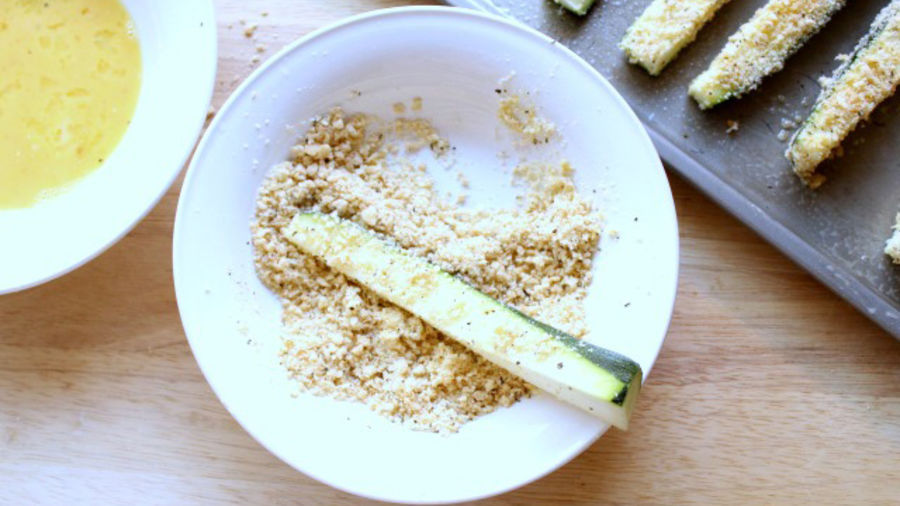 Using a fork, put the zucchini sticks in the mixture of egg and then dip them in the bread crumbs.