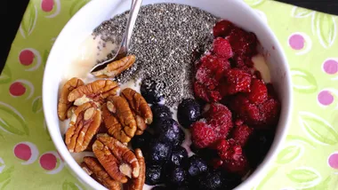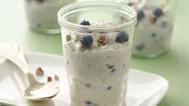 In a microwave safe bowl, combine 1 cup Cheerios™, 1/4 cup blueberries, half a banana, 1 teaspoon of chopped walnuts, 1 tablespoon of cranberries and 1/4 cup of skim milk.