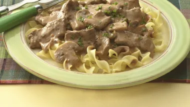 Meanwhile, cook and drain noodles as directed on package. Place noodles on serving platter; ladle beef mixture over top. Sprinkle with parsley.