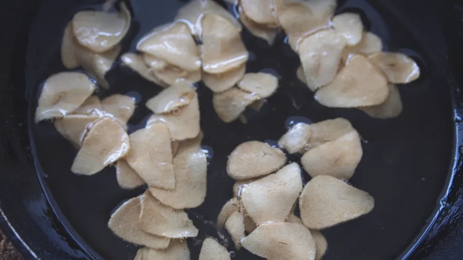 Peel and cut the garlic into really thin slices. Put the slices in a pan with the olive oil and simmer until they turn golden. Don’t let them get too brown because the garlic could get bitter. Remove from the stove and set them aside.