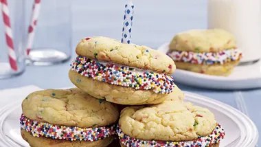 Spread the frosting on the flat side (the bottom) of a "pie" or cookie, and cover with another cookie to form a whoopie. Repeat with all the cookies. Serve.