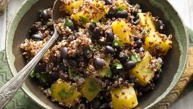 Together with Peru, Bolivia is the leading producer of quinoa in the world. Besides harvesting many different varieties of this seed, it's prepared and consumed massively throughout the region in a number of deliciosa and unique dishes. As I was contemplating the recipe for this post, I reminisced over the numerous Bolivian recipes I've tasted and finally decided on this exquisita quinoa salad that's extra nutritious and easy to prepare. If you're a vegetarian, it's a complete dish in itself. It also serves as a handy and refrescante side-dish with beef, fish or chicken. Having a summer barbecue with some grilled meat and veggies? Even better for serving alongside this dish. What I especially like about this salad is that you practically don't have to cook anything else apart from the quinoa! If it's more convenient, you can also purchase canned frijoles to use in this recipe. Just make sure to wash and drain the beans several times before using. Besides red beans, black, kidney, pinto and even lima beans also work well with this dish. Lima beans will create a distinct sabor and personality in this salad as a tasty alternative to using typical beans. Don't be afraid to switch the fruit used, but overall it's important to preserve the fruit-element of this recipe as it provides a crucial element of sweetness to the salad, as well as adding an enticing 'perfume' to this dish. Did you know that fruit makes a perfect combination with quinoa? Now that you know, let your imagination fly to create your own customized salad using your favorite flavors.