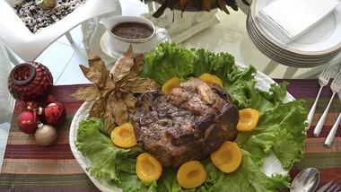 • Enjoy your dinner with his ham glazed with orange and bourbon.