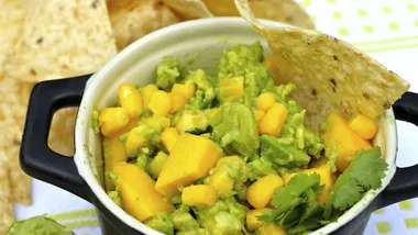 • A fruity guacamole tastefully tops off quesadillas loaded with Brie and ham.