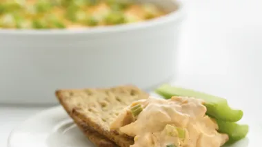 In a large bowl, mix the sour cream, the Buffalo sauce, cream cheese, onion, and garlic; add salt and pepper to taste. Add the shredded chicken, mixing well until it’s covered completely in sauce.