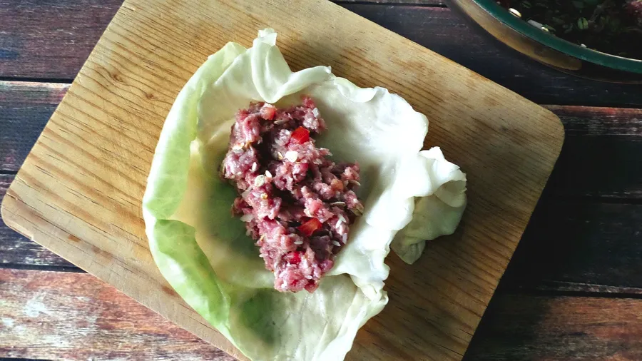Place 3 to 4 tablespoons of ground beef stuffing in the center of each leaf.