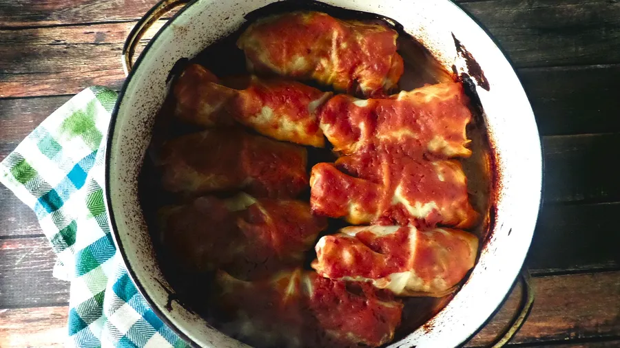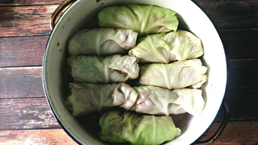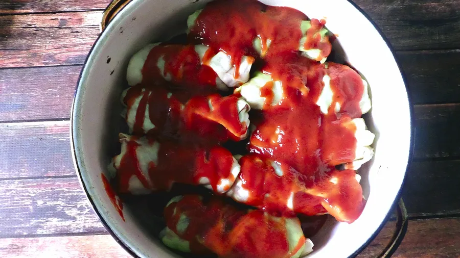 Arrange the cabbage rolls with the fold down into the pan or baking dish.