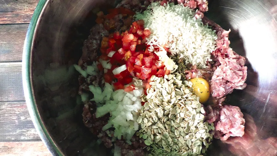 Mix ground beef, rice, oats, egg, tomatoes, onion and garlic in a bowl; season with salt and dried oregano.